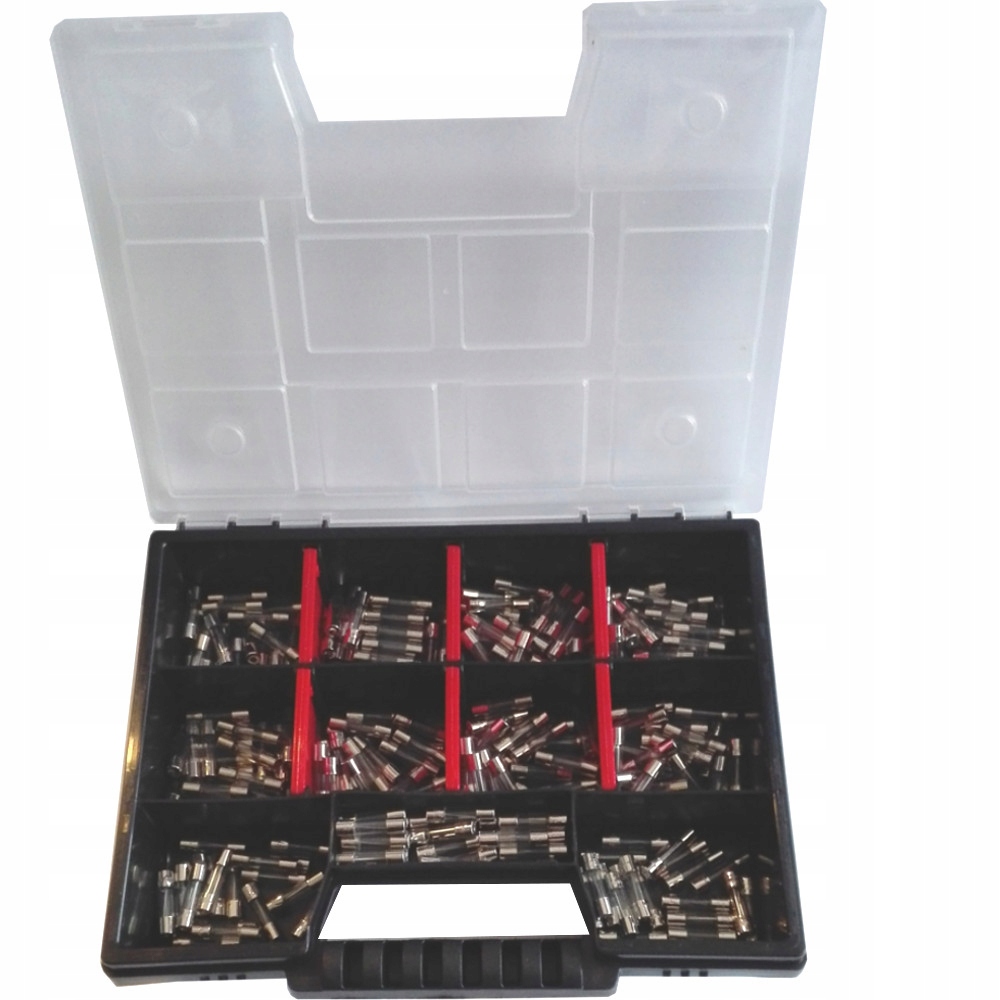 Zestaw 200 bezpieczników 20mm szklanych w organizerze, obudowa plastikowa w kolorze czarnym z zatrzaskiem oraz przezroczystą górną pokrywką. Bezpieczniki o wartościach od 1,25A do 13A
